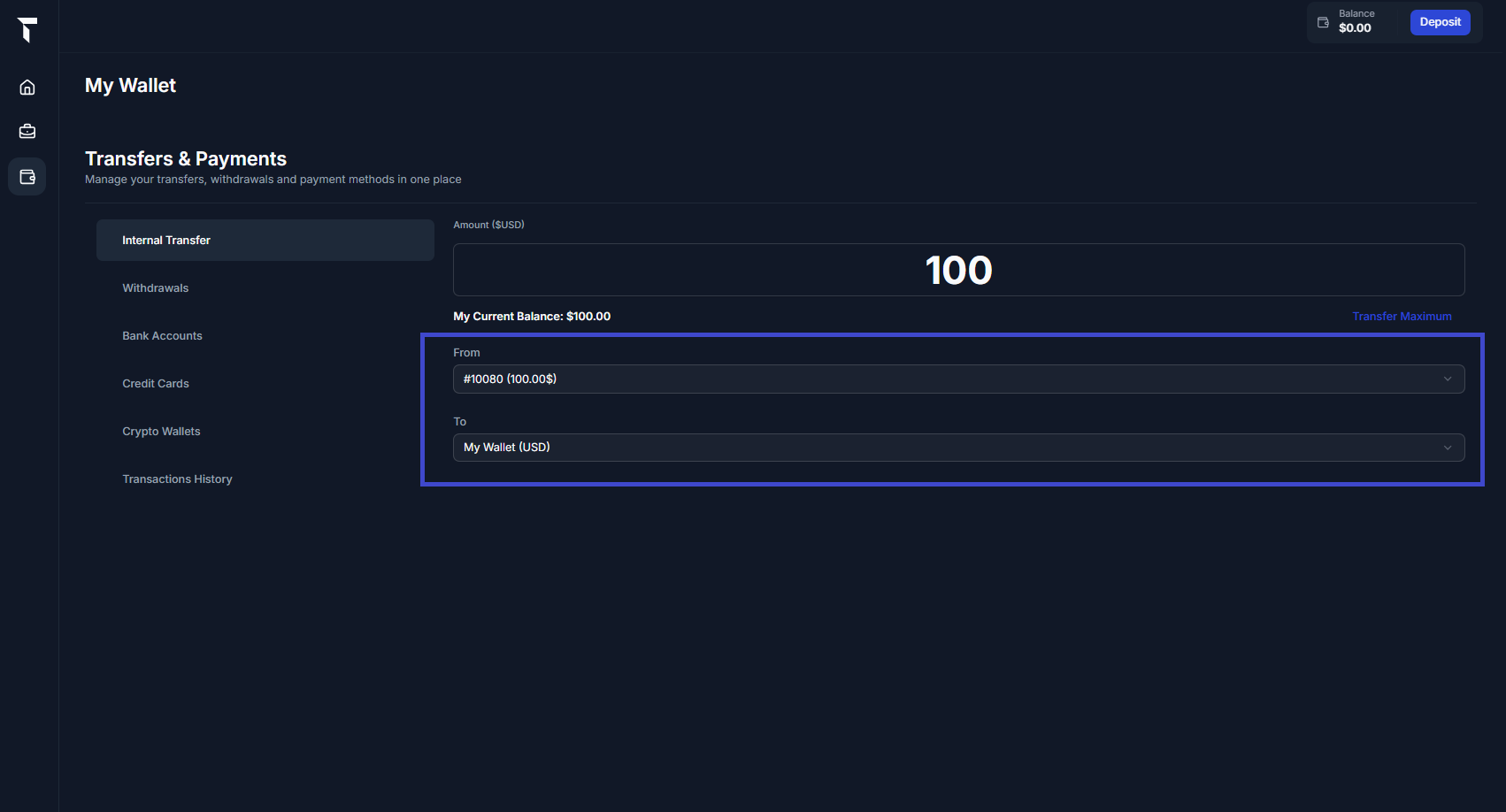 Click on Internal Transfer and move the amount you want to withdraw into My Wallet.