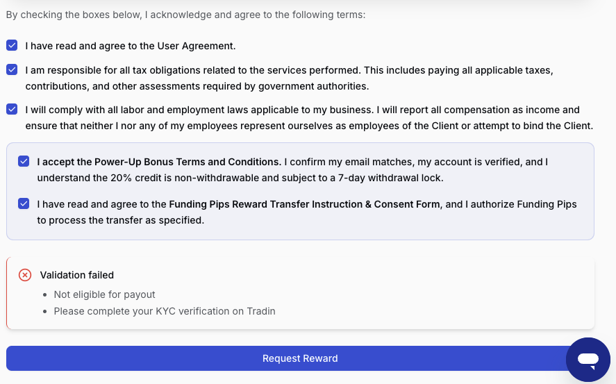 The Power-Up Bonus is a special 20% trading credit for clients who transfer their rewards from FundingPips directly into a verified Tradin CFD Brokerage account. This 20% non-withdrawable trading credit is intended solely to enhance trading margin and potential exposure.